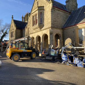 The railway station underwent a complete overhaul and re-modelling to create a new ticket office with ancillary rooms and commercial space. The extensive refurbishment included numerous major stone adaptations to doorways and windows within the external envelope of the structure. We also carried out the decontamination, cleaning and traditional lime pointing of the facades whilst working alongside the main East Coast railway line. As part of the restoration requirements, the original fifteen decorative masonry chimney stacks were reinstated onto the building. We used a scaffolding runway system designed to allow movement of each stone component via beams and hoists from scaffold loading bays. These now form the centre piece of the building and can be seen at a distance from across the town.